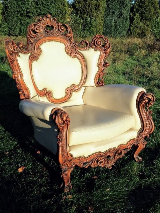 Stap binnen in een wereld van weelde met deze prachtige barokke fauteuil, een waar bewijs van de grandeur van een vervlogen tijdperk. Het weelderige ontwerp, gekenmerkt door ingewikkelde houtsnijwerken en een rijk, sierlijk frame, nodigt uit tot pure luxe en verfijning. Perfect om een vleugje elegantie toe te voegen aan elke woonruimte; deze stoel is niet zomaar een meubelstuk, maar een statement van stijl en elegantie.
