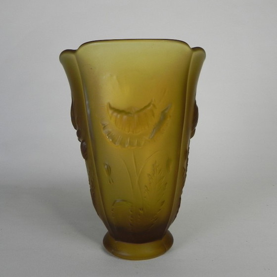 Persglazen vaas uit Bohemen, uitgevoerd in mat amberkleurig glas en voorzien van reliëfdecoratie met vier verschillende bloemen.