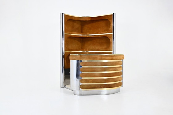 De set bestaat uit een meubel met 3 verlichte planken in suède, verchroomd metaal en messing. Het bevat ook een toonbank in suède en verchroomd metaal met een spiegelend blad, een koelkast en een vitrinekast met een plank. De vloer is bedekt met tapijt.