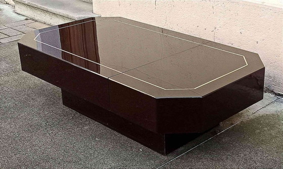 De vorm en de gelakte afwerking met verchroomde messing accenten maken het een typisch meubelstuk uit de jaren 70.