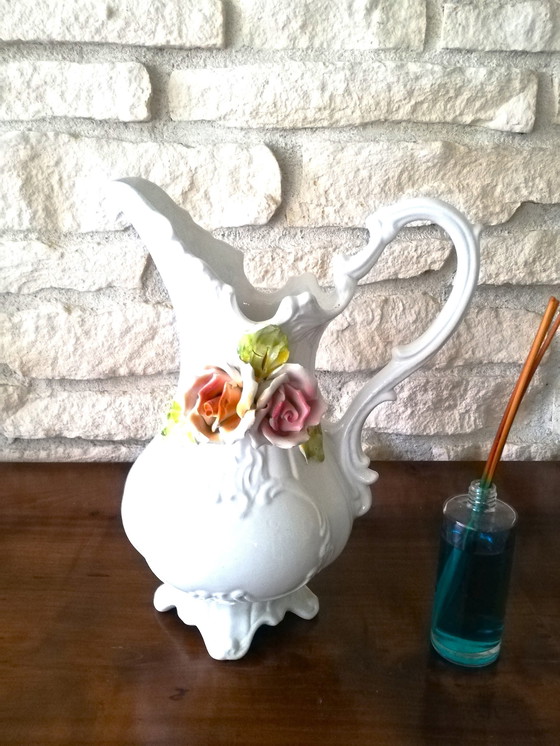 De kan die we hier aanbieden heeft de stempel "Bassano" en is gemaakt van keramiek met prachtige bloemdecoraties. De rozen zijn met de hand gemaakt en zorgvuldig op de voorkant geplaatst, en een groot, rond handvat geeft het een langwerpig effect.