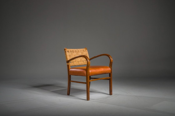 Te koop aangeboden is een uitzonderlijke op Bauhaus geïnspireerde fauteuil uit 1930, ontworpen door de bekende Zweedse architect Axel Larsson en vervaardigd door Bodafors. Dit elegante stuk combineert natuurlijk lederen bekleding op de zitting met een kenmerkende geweven touwrugleuning, allemaal op een stevig massief beukenhouten frame.