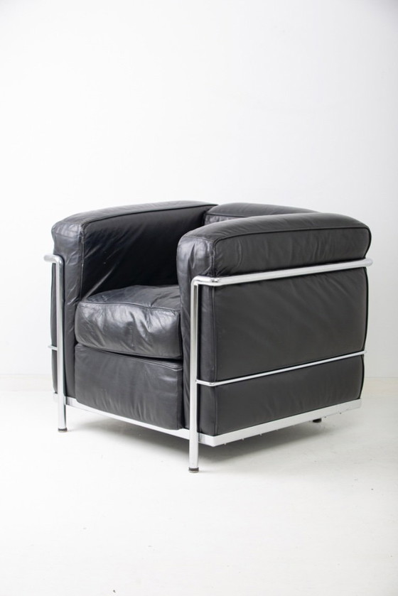 Cassina Vintage fauteuil in jaren 90 stijl. Deze fauteuil straalt verfijning uit met zijn elegante zwarte lederen bekleding, perfect aangevuld door een stevig metalen frame. Het tijdloze ontwerp maakt hem een ideale aanvulling op elke moderne of vintage-geïnspireerde woonruimte.
