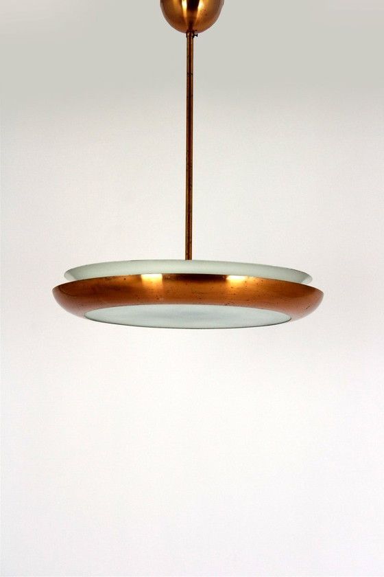 Deze Bauhaus UFO-hanglamp is ontworpen door Josef Hurka voor Napako. Hij werd vervaardigd in de jaren 1930/1940 in Tsjechië. De lamp verkeert in originele vintage staat met een mooie patina.