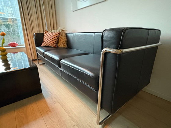 Driezitsbank in Le Corbusier LC2/LC3-stijl. Zwart leder met verchroomd stalen buisframe. 225x73x76cm. Lichte gebruikssporen en scheurtje in naad bovenkant leuning (nauwelijks zichtbaar)