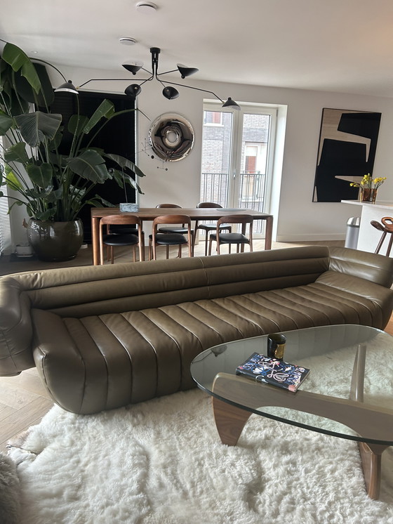 Originele Baxter Tactile sofa, handgemaakt in Italië en bekleed met zacht anilineleer in een warme bruin/taupe tint - een handtekening van Baxters iconische stijl en ambachtelijke kwaliteit.