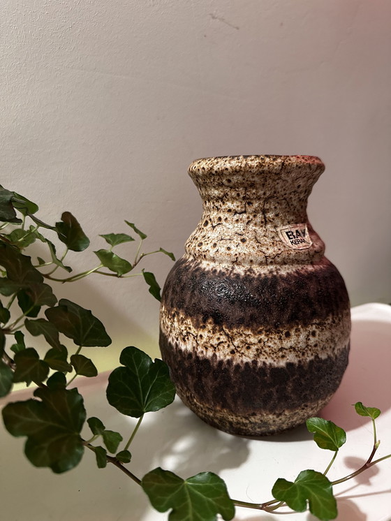 Een supertoffe Bay West Germany vaas. Bruin beige look en nog helemaal in een top staat. Heeft nog een orgineel merkstickertje en gemerkt onder. Dateert jaren 70 afkomstig uit Duitsland. Gemaakt van keramiek Afmetingen hoog 16 cm breed 13 cm Q504