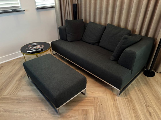 Een mooie 2-zits bank van B&B Italia in antraciet grijze stof, met poef.