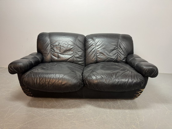 Beautiful Big Black Leather Postmodern Italian Design Space Age 2-Seat Lounge Sofa with Brass Buttons and Playful Cord Lacing.