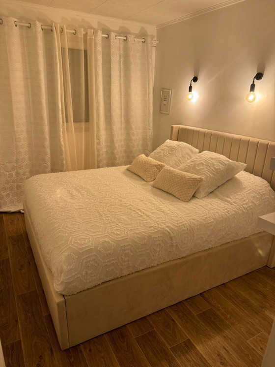 Elegant beige gestoffeerd bedframe met een modern, gewatteerd hoofdbord, ontworpen om comfort en stijl in uw slaapkamer te brengen. De zachte stof en de stevige lattenbodem bieden uitstekende ondersteuning voor uw matras, waardoor het de perfecte keuze is voor een gezellige en eigentijdse slaapruimte. 🛏️✨ We hebben beige en grijs op voorraad.