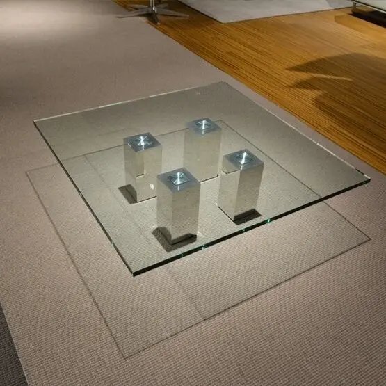 Beek Abel salontafel - 100 x 100 x 27,5 cm Blad in helder glas Poot alluminium gepolijsten blok poten Het blad heeft gebruiksporen