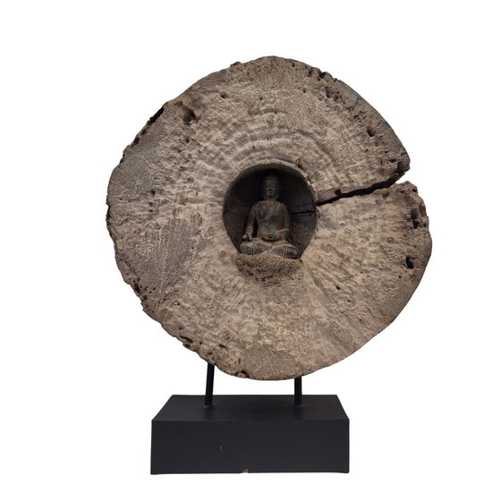 Houtsculptuur / Houtsnijwerk "Boeddha", 20e eeuw - Azië Prachtig en origineel Aziatisch beeldhouwwerk van hout. De compositie is opvallend, oprijzend uit een stuk boomstam, met een Boeddha gesneden in het midden van de nerf. Het contrast tussen de organische textuur en de geometrie van de cirkel wordt gespeeld, wat een idee van harmonie en contemplatie versterkt, benadrukt door de centrale nis waar de Boeddha is geplaatst. Boeddha daarentegen presenteert een traditionele iconografie, met een meditatieve houding en vloeiende kleding. Het geërodeerde hout suggereert een proces van natuurlijke slijtage, terwijl menselijk ingrijpen in het snijwerk een symbolische en spirituele betekenis geeft. De metalen basis verheft het stuk en benadrukt het sculpturale karakter. Gemaakt in de 20e eeuw, waarschijnlijk in Thailand. Ondersteuningstechniek: Houtsnijwerk Stijl: Oriëntaals Periode: 20e eeuw Land van herkomst: Aziatisch continent Goede staat volgens leeftijd en gebruik Afmetingen: 47 x 37 x 12 cm. Omtrek: 37 x 37 x 10 cm. De verzendkosten zijn voor rekening van de koper, afhankelijk van de afmetingen, het gewicht en de bestemming. We nemen contact met u op om de verzending te regelen en een offerte af te spreken. De verzendkosten zijn inclusief professionele verpakking op maat en gepersonaliseerde verzending, inclusief trackingnummer en garantie. De koper is verantwoordelijk voor het betalen van invoerrechten en bijbehorende belastingen in het land van bestemming. Houd er rekening mee dat de verkoper niet verantwoordelijk is voor eventuele douanekosten, aangezien deze worden geheven in het land van bestemming en het te betalen bedrag wordt bepaald door de douane van dat land. Indien een exportvergunning vereist is, zijn de kosten voor rekening van de koper. De kosten hangen af van de waarde van het te exporteren kunstwerk.