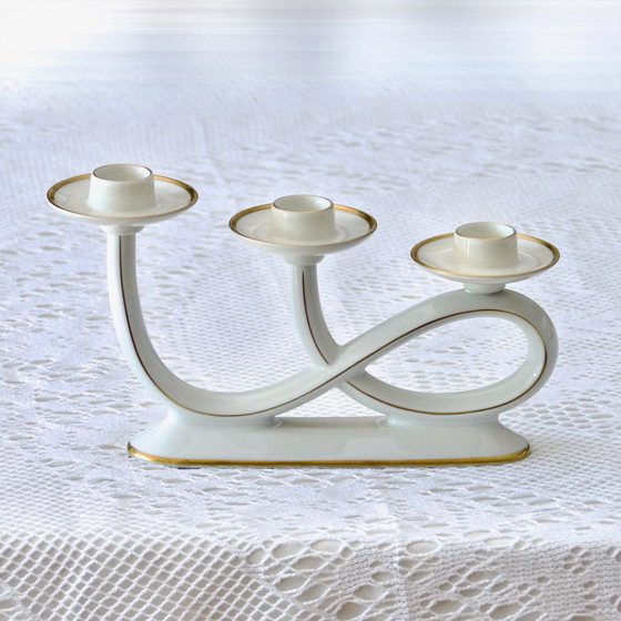 Een prachtige en tijdloze kandelaar met drie takken van Beiers porselein, gestempeld Edelstein Bavaria en genummerd. Zacht roomwit met gouden rand.