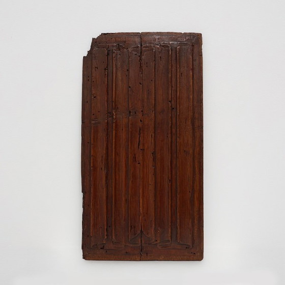 Een fijn gesneden gotisch eikenhouten paneel uit het 16e-eeuwse België. Dit architectonische fragment heeft sierlijke verticale cannelures, omlijst door elegante, vloeiende bogen aan zowel de boven- als onderkant – een ingetogen maar toch uitgesproken gotisch motief. De diepe, warme patina en zichtbare sporen van handgereedschap getuigen van eeuwenlange geschiedenis en vakmanschap.