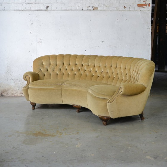 Deze gebogen Chesterfield-achtige bank uit de jaren 50 biedt plaats aan drie personen en straalt klassieke elegantie uit. De bank is bekleed met olijfgroene fluweel en heeft een stevige houten en metalen constructie. Perfect voor een vintage of klassieke inrichting.