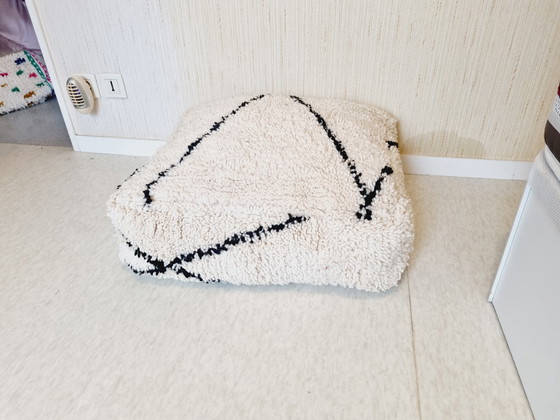 Deze unieke Marokkaanse wollen poef is handgemaakt door Berbervrouwen met behulp van Beni Ourain-tapijten uit Marokko. Elke poef is uniek en voorzien van een Berbersymbool.