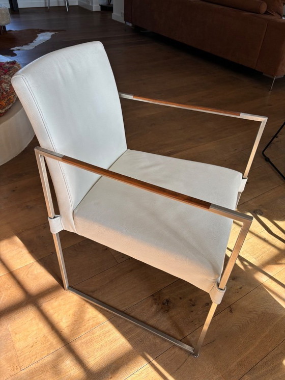 Bert Plantagie echt leren eetkamerstoelen met houten inleg in de armleuningen. Zeer comfortabel en in zeer goede staat. Goed onderhouden. Kleur is gebroken wit/licht beige.