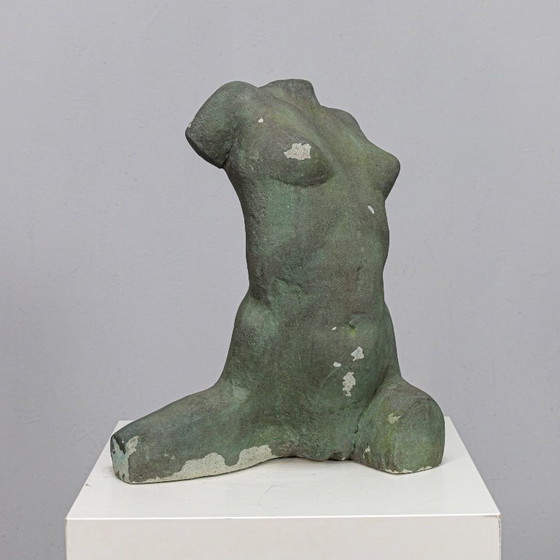 Een sculpturaal vrouwelijk torso, vervaardigd in beton door de Nederlandse kunstenares Francine Govers in de jaren 90. Het oppervlak wordt gekenmerkt door een rijk ontwikkelde patina, met natuurlijke variaties in tint en textuur die het ruwe en tactiele karakter van het materiaal benadrukken.