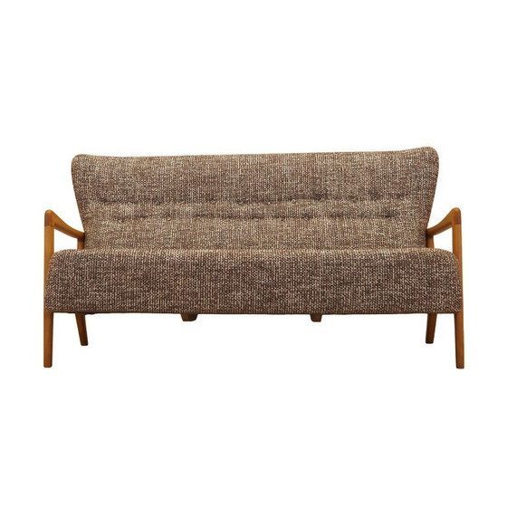 Het frame is gemaakt van massief hout. De poten en armleuningen zijn gemaakt van massief beukenhout. De bank is opnieuw bekleed, waarbij de stof is vervangen door een nieuwe. Er is een hoogwaardige gemêleerde stof in bruin en wit gebruikt.