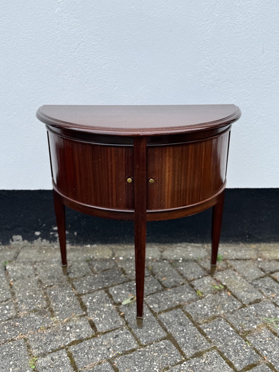 Deze elegante bijzettafel met halve maan is een tijdloos stuk dat een vleugje verfijning toevoegt aan elke kamer. Gemaakt van rijk bruin hout, is de vintage charme duidelijk zichtbaar in het klassieke ontwerp en het fijne vakmanschap. Perfect om tegen een muur te plaatsen of als een op zichzelf staand accent, deze tafel biedt zowel functionaliteit als stijl.
