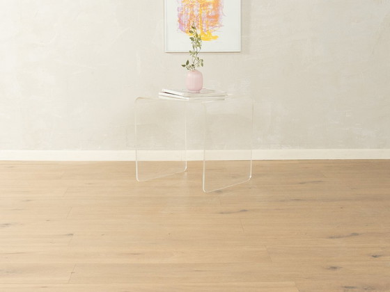 Minimalistische bijzettafel uit de jaren 70, gekenmerkt door zijn zwevende transparantie en naadloze ontwerp. Gemaakt uit één gebogen stuk acrylglas, toont de tafel innovatieve productietechnieken uit het ruimtetijdperk. Het meubelstuk is zorgvuldig gereinigd en verkeert in zeer goede vintage staat. Lichte, authentieke gebruikssporen vertellen het verhaal van voorbije decennia.