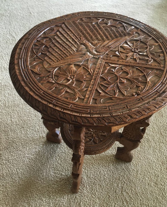 Mooi gedetailleerd bewerkte houten bijzettafel.