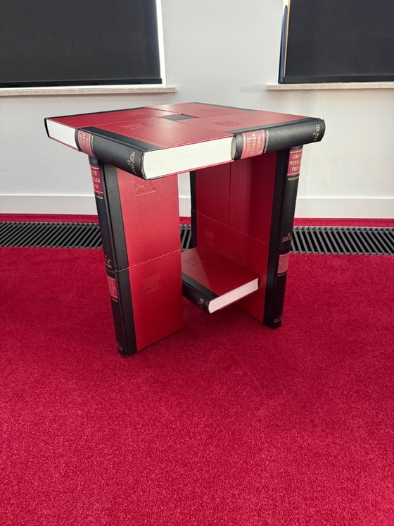 Ontdek de unieke charme van deze bijzettafel, met de hand vervaardigd uit 11 willekeurige delen van een grote Winkler Prins encyclopedie.