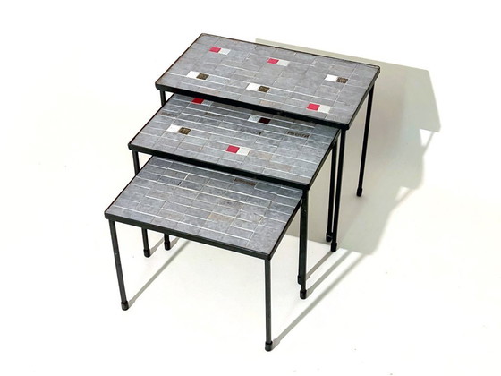3 tafeltjes zijn gemaakt van een zwart metalen onderstel en ingelegd met keramische mozaïektegels in kleurenschakering rood-wit-grijs-zwart en zilvergouden details