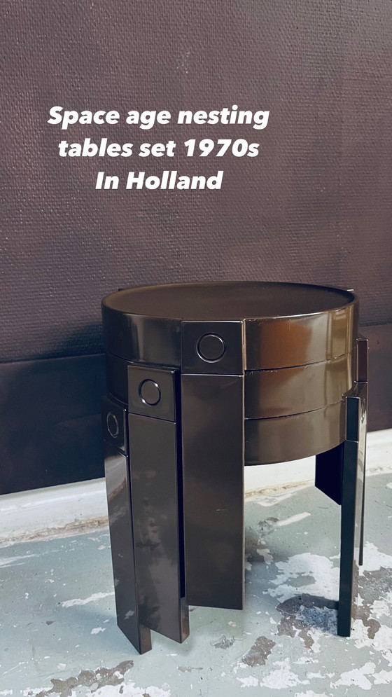 Dit is een set van drie space age nesttafels uit de jaren 1970, gemaakt in Nederland. De tafels hebben een strak, bruin plastic ontwerp dat de futuristische esthetiek van die tijd belichaamt. Perfect om een vleugje retrostijl toe te voegen aan elke kamer. Deze tafels zijn zowel functioneel als stijlvol en passen gemakkelijk in verschillende ruimtes.