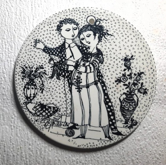 Bjørn Wiinblad Nymølle Wandplaat – November "OPTIMISME" – Teder omhelzend paar met bloemen & breiwerk – Vintage Deens liefdesverhaal.