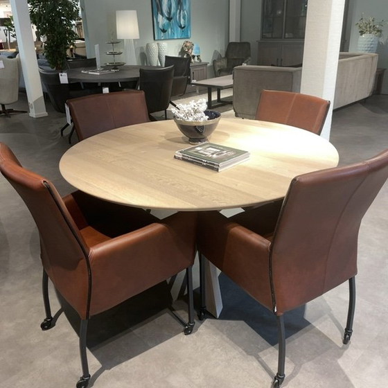 BKS Meubelen 5019 Join eettafel - Ø140 Een stijlvolle ronde eettafel met een massief houten driepoot. Met een afwerking van een verjongd en geschraapt (2,7cm) blad. Perfect om gezellig aan te tafelen. Afmeting: 140 rond Kleur: Smoked Grey oil light (B)