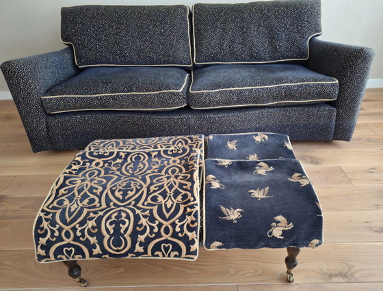 Prachtige donkerblauwe bank in Engelse stijl, afgewerkt met subtiele goudkleurige ingeworven stippen. Bijpassende hocker met donkerhouten poten op wieltjes maakt de set compleet.