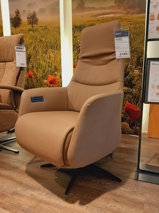 **SHOWROOMMODEL** Relaxfauteuil Blomira L bruin leer, uit de eigentijdse INHOUSE collectie. In leder Dino 511 met 2-motorige relaxfunctie, zwart bedieningspaneel en metalen kruispoot. Stijlvol comfort in een luxe afwerking. Afmeting: 114x72x78 cm. Te beleven bij Löwik Wonen & Slapen, de grootste meubelboulevard van Oost-Nederland!