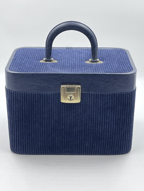 Schitterende jaren 70 beautycase in marineblauw ribfluweel. Zeer schoon interieur. Zeer goede staat. Afmetingen: 34 x 22 x H 24 cm