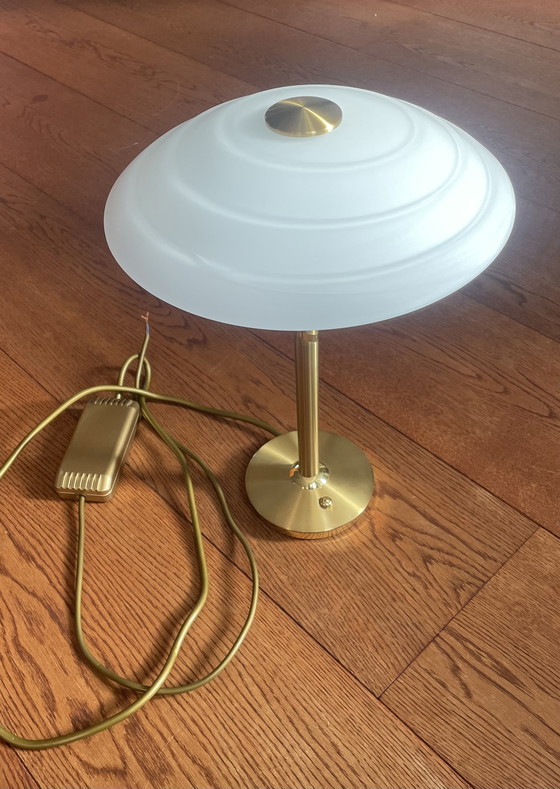 B+M Leuchten Tafellamp mat/gepolijst messing mat wit gevlamd glas Jaren 90