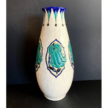 Art Deco vaas van cloisonné-emaille in ovale vorm, vervaardigd in 1922 door Maurice Dufrène, decorateur voor de Boch Keramis-fabriek, voor "La Maîtrise", het kunstatelier van Galeries Lafayette in Parijs. De vaas is versierd met een doorlopend patroon van turquoise geëmailleerde bloemen op een gecraqueleerde witte achtergrond.