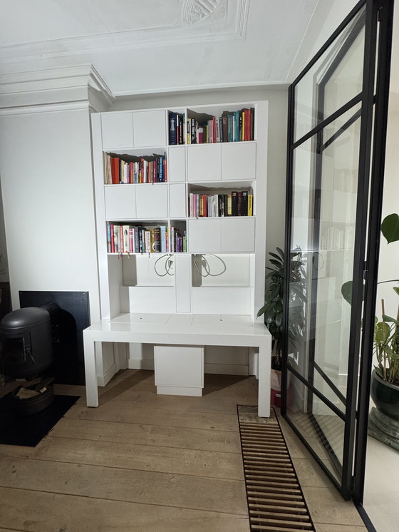 Deze elegante combinatie van boekenkast en bureau biedt een verfijnde oplossing voor uw thuiskantoor of studeerkamer. Dit meubelstuk heeft een strak, modern design en combineert functionaliteit naadloos met stijl, waardoor het een perfecte aanvulling is op elke moderne ruimte.