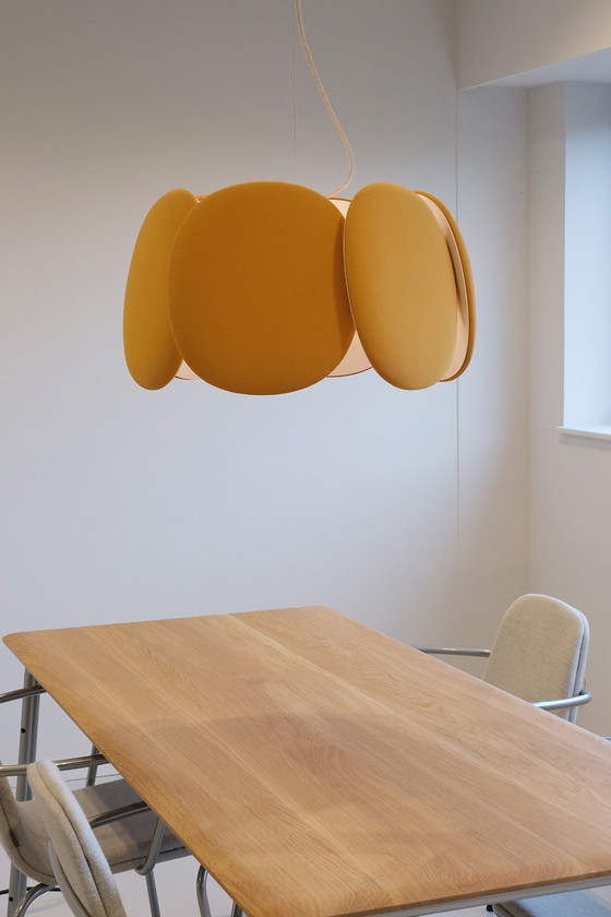 Deze Blossom maat L hanglamp heeft een wit frame en fel oranje gestoffeerde kap. De lamp is gebruikt voor fotoshoots en presentaties. De bekleding is van Gabriel, collectie Atlantic screen. De lamp ziet eruit als nieuw.