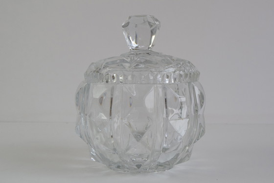 Prachtige vintage Boheemse kristallen suikerpot met ingewikkelde handgeslepen ontwerpen. Dit prachtige stuk is gemaakt van helder kristal en toont een prachtig patroon van geometrische sneden en bloemmotieven, afgetopt met een fijn gefacetteerd deksel. De suikerpot weerspiegelt de hoge ambachtelijke traditie van Boheems glas, dat wereldwijd bekend staat om zijn helderheid en schittering. Perfect als verfijnd accent voor je eettafel of als luxe aanvulling op elke kristallen collectie.