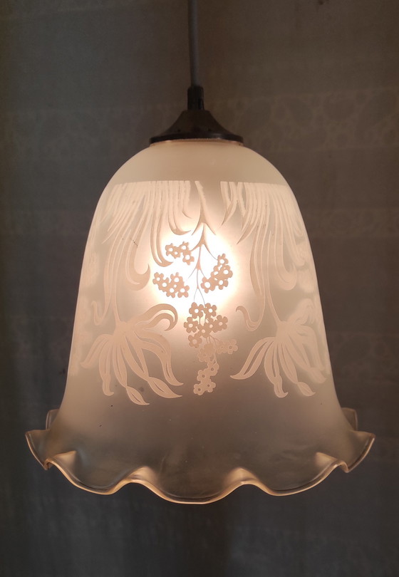 Bolvormige hanglamp van gezeefdrukt glas met bloemmotieven - midden 20e eeuw