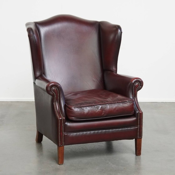 Aangeboden deze mooie en comfortabele bordeauxrode rundleren oorfauteuil in Engelse stijl met een geweldig patina.