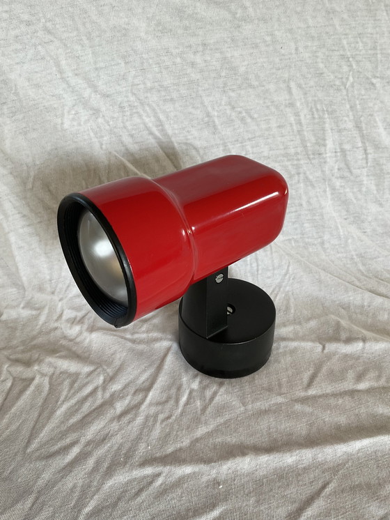 Brandweer rode wandlamp/spot 1970. Hoog 16 cm, kap rond 7 cm. Stroomaansluiting (kroonsteen) zit in lampvoet, bereikbaar via schroef. Lamp is van metaal. Voet is van kunststof