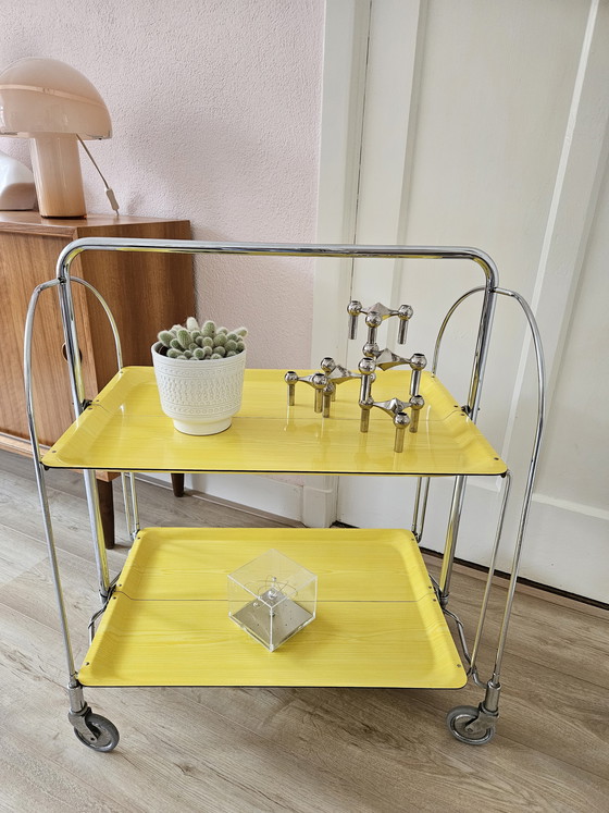 Haal het zonnetje in huis met deze Dinett serveerwagen/trolley💛. Rechtstreeks uit het Space Age tijdperk komt dit item🚀. Chroom frame met gele onderhoudsvrije gelamineerde plateaus met houtstructuur. Hoogwaardige kwaliteit. Merk; Bremshey Germany '60/'70 Op verschillende manieren te gebruiken & te stylen. Tevens volledig inklapbaar. Verkeert in uitmuntende vintage staat.