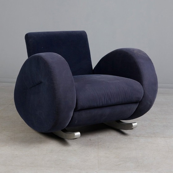 Ervaar de ultieme jaren 80-designstijl met deze opvallende Bretz schommelstoel, een ware blikvanger voor elke woonkamer. Bekleed met luxueus blauw fluweel, straalt deze fauteuil zowel comfort als stijl uit, waardoor het een ideale aanvulling is op elk verfijnd interieur.