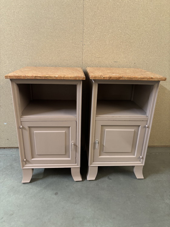 Introducing a pair of exquisite brocante nightstands, perfect for adding a touch of vintage charm to your bedroom. These elegant pieces feature a sophisticated beige finish complemented by a luxurious marble top, offering both style and functionality.