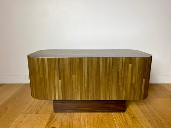 Bijzettafel / salontafel. Onderstel en blad van macassar ebbenhout. Afgewerkt met satijnvernis voor optimale bescherming en een spiegeleffect. Stro-inleg rond de rand in brons. Afgeronde hoeken contrasteren met de discrete rechthoekige basis, wat een hangend effect geeft aan de structuur van het stuk. Uniek stuk, gedateerd en gesigneerd, gemaakt in het atelier van bcmobilier.