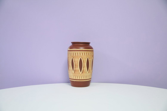 Een vintage bruin & beige West Germany vaas geometrische vormen, genummerd 252-20. Deze vintage vaas is afkomstig uit een set van een heel lief verzamelaars stel. Prachtig om te combineren met een andere vintage West Germany vaas.