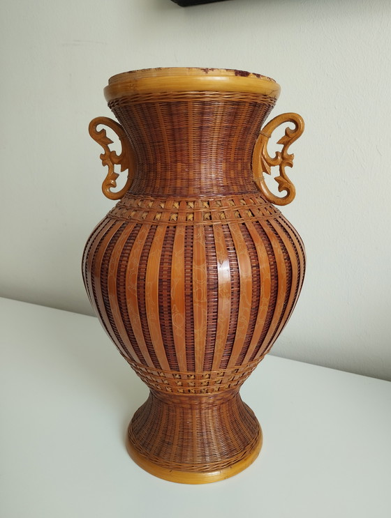 Deze bruine rieten vaas van Zhejiang Handicrafts is van uitzonderlijke kwaliteit en met de hand gemaakt in Shanghai.