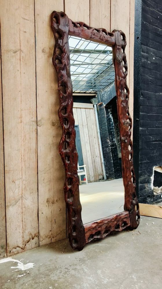 Deze prachtige handgesneden spiegel uit het Zwarte Woud is een uniek stuk in brutalistische stijl. De robuuste houten lijst heeft een karakteristiek patroon dat de natuurlijke schoonheid van het hout benadrukt. Perfect voor liefhebbers van vintage en unieke interieurstukken.