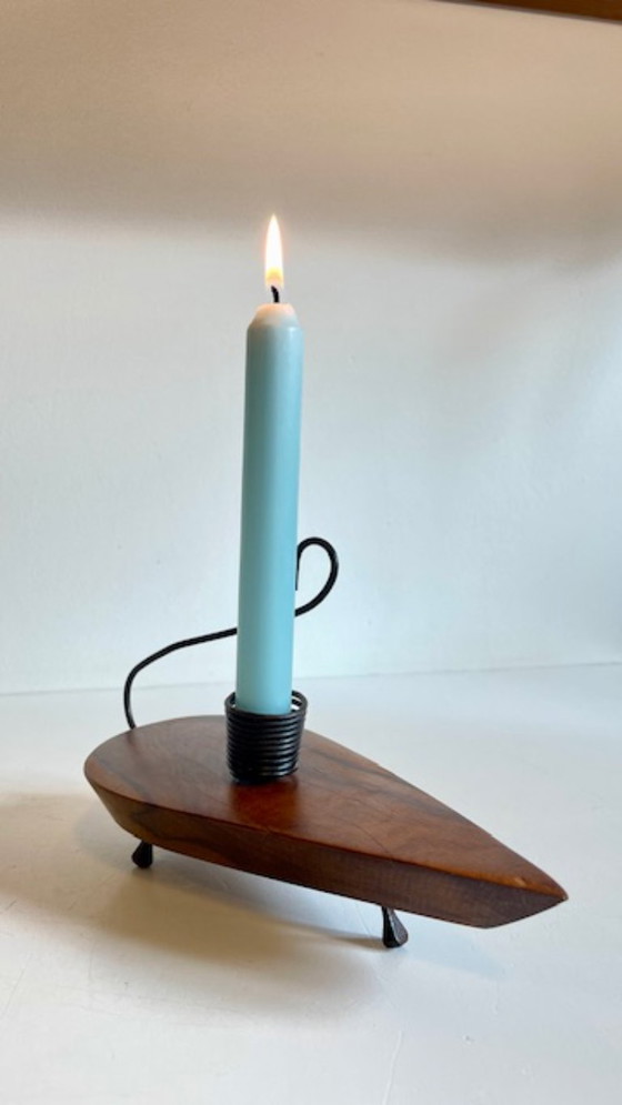 Schitterende brutalistische kaarsenhouder van olijfhout en vintage staal, een kandelaar in de vorm van een geestenlamp, een pareltje!